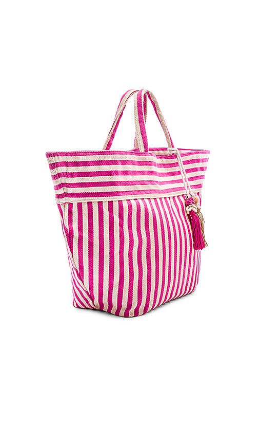 A smaller version of our best selling beach bag. Handwoven nautical cotton textile with mix of wide and narrow stripes makes the perfect summer beach tote. Features detachable fringed tassel, bead, pom pom tassels and puka shell accents. This bag is vegan.