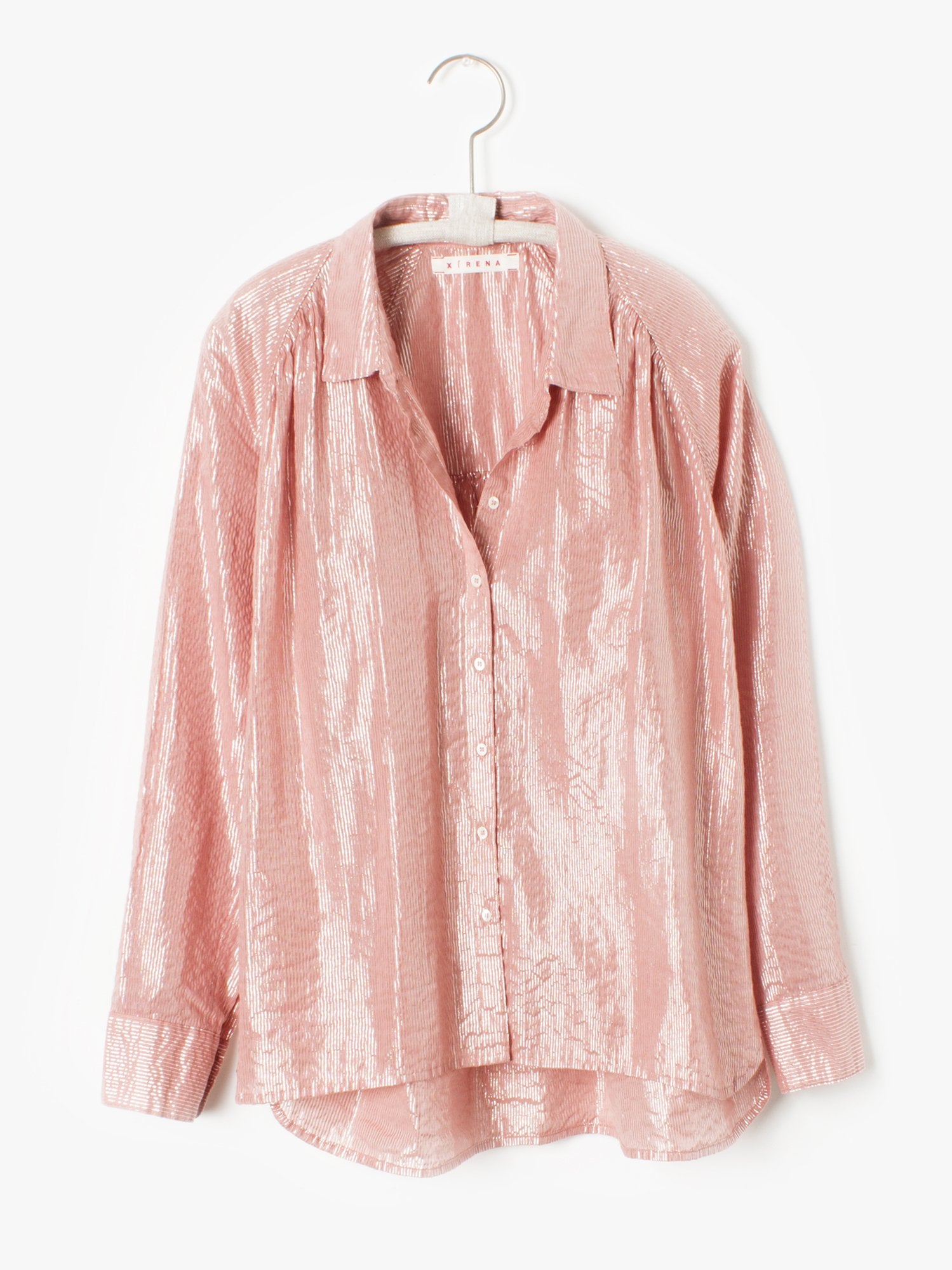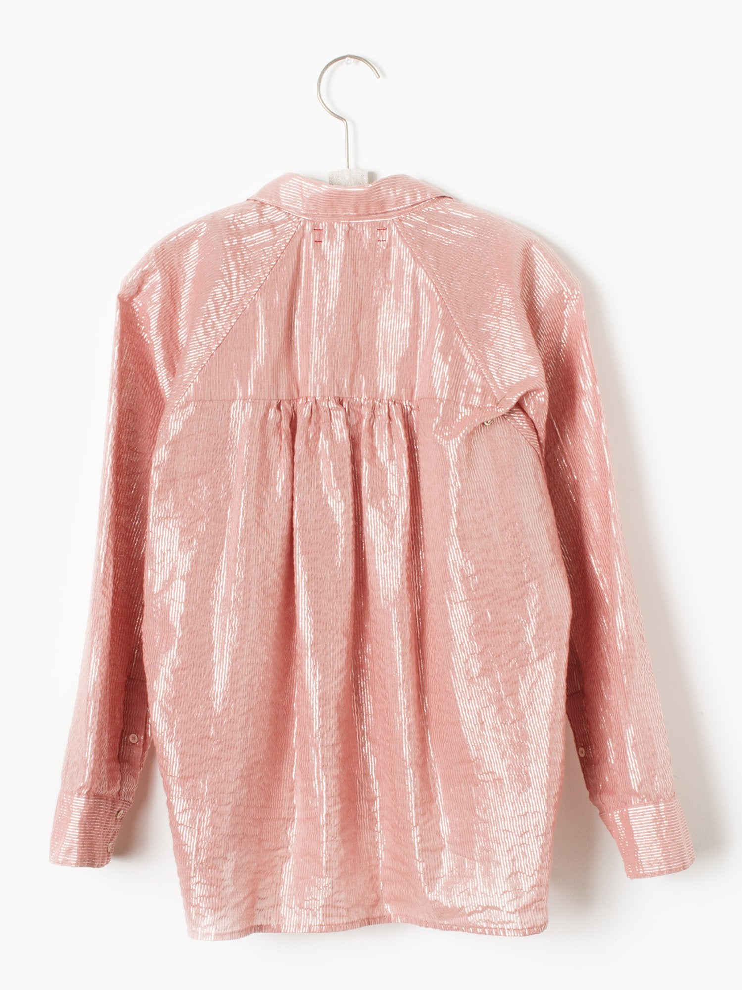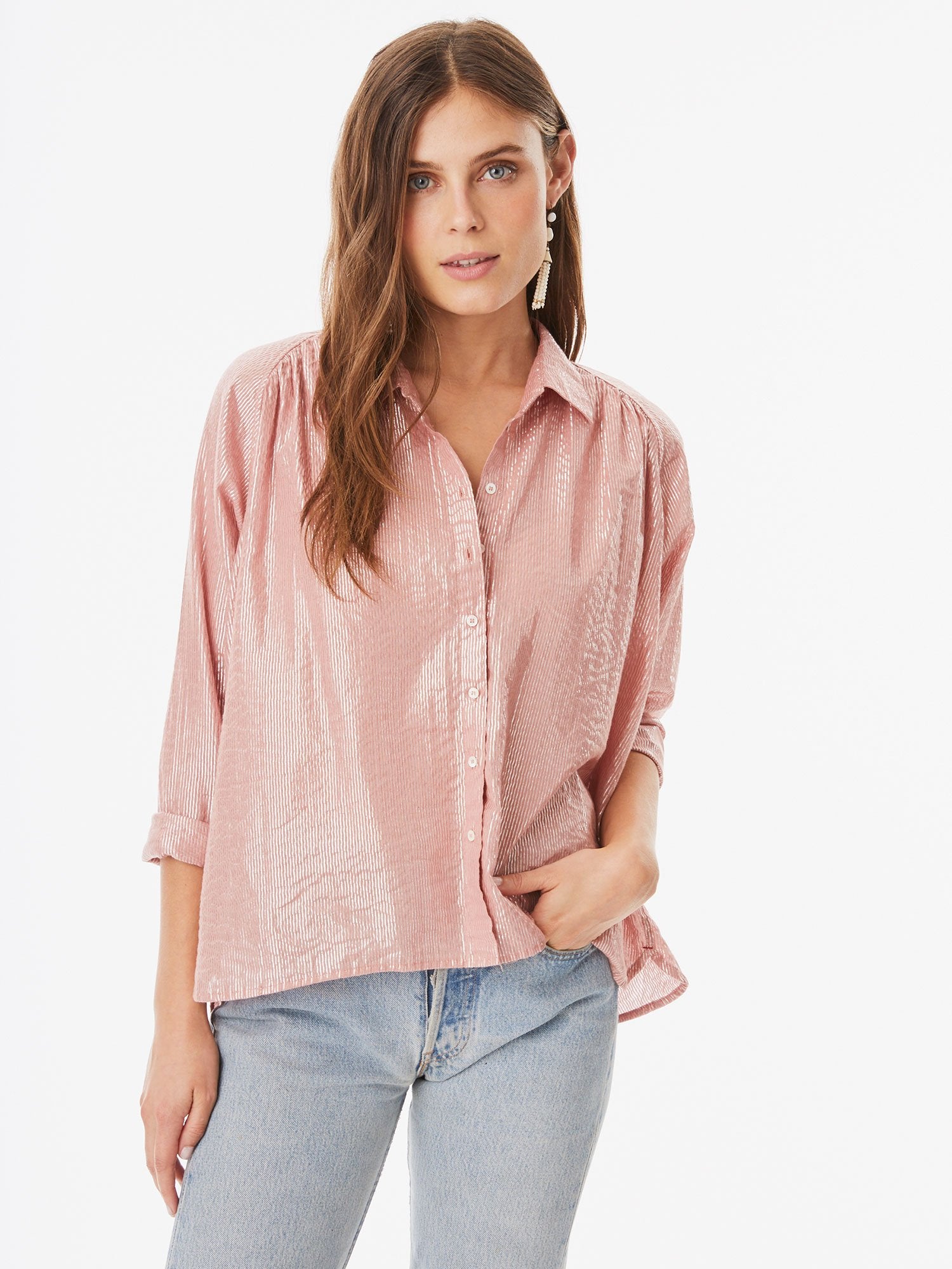 The Kiran Shirt is effortless and swingy and in a subtle metallic moonstone stripe.