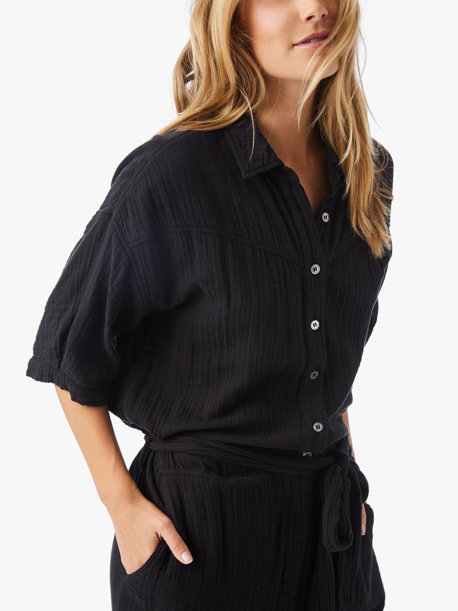 This is Theo. Our button down jumpsuit in Chelsea Gauze. Theo has an adjustable tie belt, front pockets and a relaxed but still put together fit.